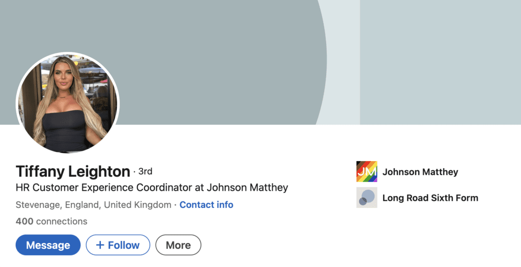 Tiffany works in HR, a very LinkedIn industry. She’s held her current HR role for over four years, and before this worked in a whole bunch of places, including a spa and at Tesco. She’s listed Steven Bartlett as an interest, so the less said about that probably the best.